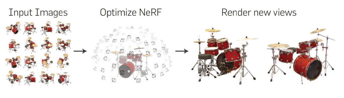 또 다른 흐름은 볼륨(volume) 기반 장면 표현 을 이용해 입력 RGB 이미지로부터 고품질의 시점 합성을 수행하는 접근입니다. 볼륨 기반 방법은 복잡한 형태와 재질을 비교적 자연스럽게 표현할 수 있고, 미분 가능한 렌더링을 통해 경사 기반 최적화 와도 잘 결합됩니다. 또한 메쉬 기반 방법에 비해 시각적으로 덜 거슬리는 아티팩트를 생성하는 경향이 있습니다.