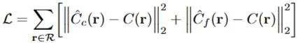최적화 반복(iteration)마다 데이터셋의 픽셀들로부터 카메라 광선을 무작위로 샘플링하고, 각 광선에 대해 개의 샘플 지점에서 네트워크를 질의하여 를 얻습니다. 이후 4절의 볼륨 렌더링 절차로 광선의 예측 색 를 계산합니다. 손실 함수는 관측 색 과 예측 색 사이의 평균 제곱 오차(MSE) 입니다.
