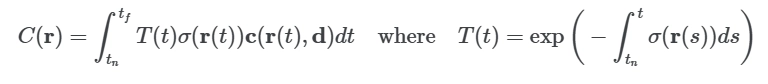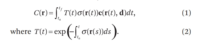 여기서 밀도 는 위치 에서 광선이 매질에 의해 흡수되거나 산란되어 “종료될” 확률과 관련된 양으로 해석할 수 있으며, 광선 방향으로 누적된 투과율(transmittance)이 함께 결합되어 최종 색을 결정합니다.