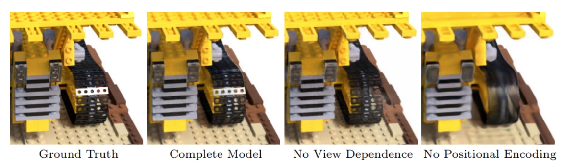 그림 4는 (1) 시점 의존성(방향 입력)이 비람버시안 반사 효과를 모델링하는 데 어떻게 기여하는지, 그리고 (2) 위치 인코딩(positional encoding)이 고주파 기하학·텍스처를 표현하는 데 왜 중요한지를 시각화합니다.