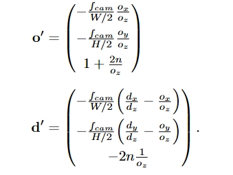구현의 마지막 세부 사항으로, 우리는 NDC 변환 전에 z = -n에서의 광선 교차점으로 o를 이동시킵니다. 이는 tn = -(n + oz )/dz에 대해 on = o + tnd로 계산합니다.