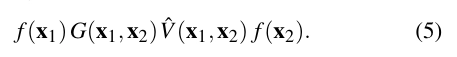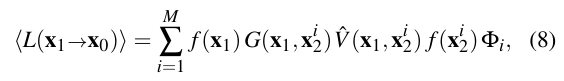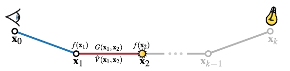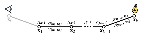 그림 4: Eq. (2)에서의 경로 투과율 T₁ₖ는 경로 꼭지점에 대한 일반화된 산란 함수 f(xᵢ)와 경로 구간에 대한 일반화된 기하학 G(x,y) 및 가시성 V(x,y) 항의 곱입니다.