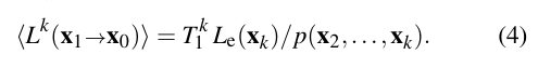 대부분의 광 전송 시뮬레이션 알고리즘은 Eq. (2)의 적분을 평가하기 위해 Monte Carlo 사분법을 사용해요. 이는 어떤 결합 확률 분포 p(x₂,...,xₖ)에서 무작위로 빛 경로 X₂ Xₖ을 선택하고, 다음과 같은 Monte Carlo 추정기를 평가하는 것을 의미해요.
