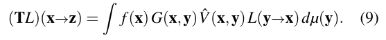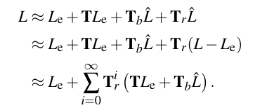 Novák 등 [NED11]은 한 번 계산된 제한된 솔루션에서 추가적인 광 전송을 계산하여 누락된 에너지를 복원할 수 있다고 언급했어요. 그들의 접근 방식을 직관적으로 설명하기 위해, 우리는 렌더링 방정식의 재귀적 형식을 사용할 것이고, 일반화된 전송 연산자 T를 정의하기 위해 연산자 표기법을 사용할 거예요 (Arvo 등 [ATS94]의 정신을 따라).