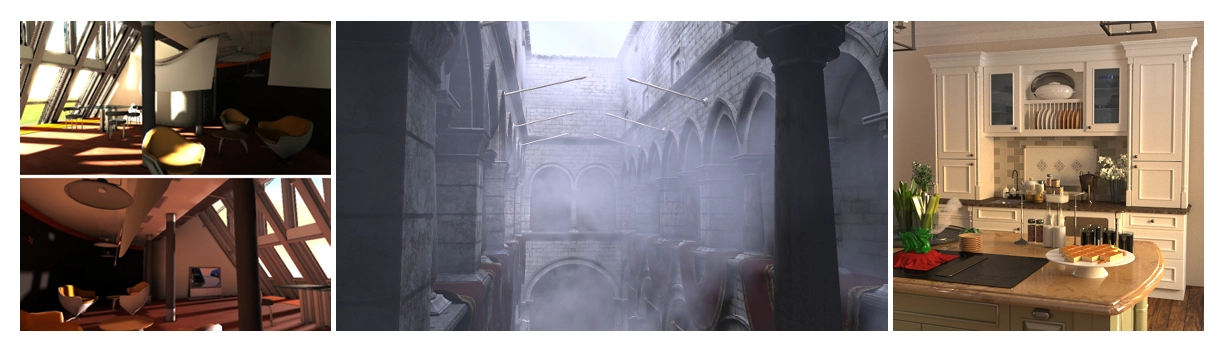 그림 1: 이 보고서에서 다루는 많은 빛 렌더링 방법들은 품질과 속도 간의 절충 축에서 다양한 지점에서 좋은 결과를 보여줘요. 왼쪽의 이미지는 [REH* 11]을 사용해 실시간으로 렌더링되었고, 확산 반사 현상을 포착했어요 (Tobias Ritschel의 제공). 가운데 이미지는 렌더링에 52분이 걸렸고, 참여 매체에 대한 많은 빛 방법을 보여줍니다 ([ENSD12]에서 수정됨). 오른쪽 이미지는 약 46분 동안 Bidirectional Lightcuts [WKB12]로 렌더링된 광택 표면, 서브서피스 BSSRDFs, 세부적인 비등방성 부피 천 모델과 같은 다양한 현상을 결합했어요.