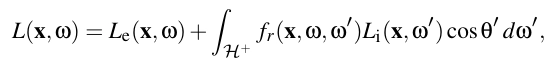 인스턴트 라디오시티(IR) 알고리즘 [Kel97]은 모든 다중 조명 방법의 기초가 돼요. 원래의 연구처럼, 우리는 이 알고리즘을 표면에 대한 방법으로 설명한 후, 3장에서 정확한 수학적 공식의 일부로 참여 매체를 포함하도록 일반화할 거예요. 먼저, 장면에서의 빛의 이동을 설명하는 렌더링 방정식 [Kaj86]으로 시작해요. 점 X에서 방향 w로 표면을 떠나는 방사휘도 L은 다음과 같이 표현돼요: