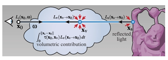 X0에서 방향 W를 따라 볼 수 있는 지점 Xs에서요. 참여 매체가 있는 장면에서는, 이 출사 복사는 X₀와 Xs 사이의 투과율 τ(X₀,Xₛ)에 의해 감쇠되어야 해요. 게다가, X0Xs 선을 따라 산란된 복사 Lᵥ의 적분을 추가합니다 (그림 3 참조): Lᵢ(x₀, ) = + (1) 0, 여기서 Xv = X₀입니다. 실제 상호작용은 확률적 샘플링 과정을 통해 생성되며, 카메라에서 시작하여 X0, X1, X2로 표시됩니다 (그림 4 참조).