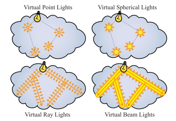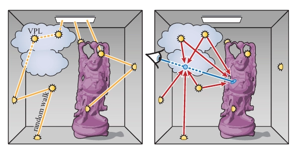 IR은 특정한 방식으로 두 개의 서브 경로 집합을 구성하는 양방향 방법이에요. 먼저, 임의의 길이를 가진 많은 수의 빛 서브 경로가 생성되고 저장됩니다. 이 서브 경로의 각 정점에 대해, 위치, 법선, 입사 방향, BRDF, 그리고 현재의 "플럭스"(즉, 광원에서 방출된 복사도가 정점까지의 경로를 통해 전달된 후 그 지점까지의 경로의 확률 밀도로 나눈 값)와 같은 완전한 지역 환경이 기록됩니다. 이렇게 저장된 데이터는 각 정점에서 모든 방향으로 산란되는 출사 조명을 계산하기에 충분하다는 것이 목표입니다. 만약 이게 가능하다면, 원래 경로의 개념을 버리고 대신 정점을 특이한 형태의 점 광원으로 모델링할 수 있어요. 이들은 장면 내의 실제 광원에 해당하지 않기 때문에, 우리는 이를 가상 점 광원(VPLs)이라고 부릅니다.