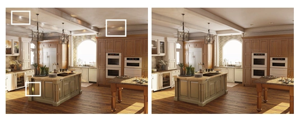 그림 8: 표준 VPL 샘플링(왼쪽)과 VPL 거절 샘플링 알고리즘[GS10](오른쪽)으로 동일한 수의 VPL로 렌더링된 장면입니다. 이미지 제공: Iliyan Georgiev.