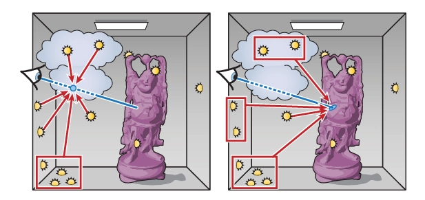 지금까지 논의된 VPL 분포 알고리즘에 의해 생성된 VPL의 밀도는 일반적으로 기하학적 공동에서 지역 간섭 반사를 충실히 렌더링하기에 불충분합니다. 이 문제를 해결하기 위해서는 광원에서 시작하는 대신 카메라에서 경로를 추적하여 VPL을 분배하는 것이 더 합리적입니다. 이 접근 방식은 렌더링될 이미지에 중요한 위치에서 VPL을 생성할 수밖에 없지만, 해결해야 할 몇 가지 중요한 기술적 문제가 있습니다: 첫째, 이러한 VPL을 광원에 명시적으로 연결하여 완전한 빛 전송 경로를 형성할 수 있도록 해야 합니다. 둘째, VPL 플럭스를 계산하는 것은 특정 VPL 위치를 생성하는 확률 밀도의 평가를 포함하며, 이는 VPL이 카메라에서 생성될 때 더 복잡하고 비용이 많이 듭니다.