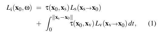 여기서는 특정 지점 X₀에서 특정 방향 w로부터의 입사 복사 Lᵢ(x₀, ) 계산에 초점을 맞출게요. 참여 매체가 없는 장면에서는, 이는 단순히 표면에서의 출사 복사 Lₛ(XₛX₀)와 같아요.