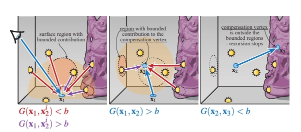 그림 11: 인근 VPL의 기여가 제한되어 있기 때문에 (보라색 화살표) (왼쪽), Kollig과 Keller [KK04]는 잔여 광 전송을 수집하기 위한 새로운 경로 세그먼트를 구성하고 (중간), 정점이 제한이 발생하는 영역 밖으로 나갈 때까지 재귀적으로 계속합니다 (오른쪽).