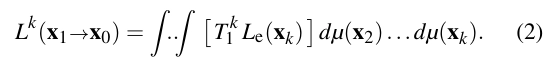 표면 지점에서의 출사 복사율, 즉 위의 방정식에서 Lₛ로 표시된 값은 2장에서 보여준 렌더링 방정식에 의해 주어져요. 매질 내에서의 산란에 의한 출사 복사율 Lv도 비슷하게 정의되며, 자세한 내용은 [PH10]을 참고하세요. 이 방정식을 k번 재귀적으로 확장하면 (여기서는 유도 과정은 생략할게요), X₁에서의 출사 복사율에 대한 일반적인 공식을 얻을 수 있어요.