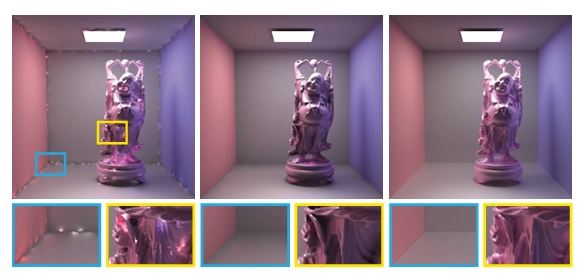 그림 10: 제한되지 않은 VPL 렌더링(왼쪽)과 제한된 VPL 렌더링(가운데)을 편향 없는 해(오른쪽)와 비교한 모습입니다.