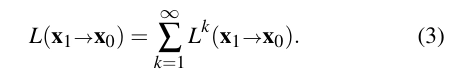 Eq. (2)는 정확히 k - 1번의 반사 후의 출사 복사율을 제공합니다. 완전한 전역 조명 해법은 모든 길이의 경로에서의 복사율의 합과 같은 평형 복사율에 의해 주어집니다: