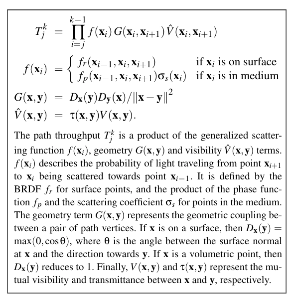 경로 투과율 Tⱼ는 일반화된 산란 함수 f(xᵢ), 기하학적 항 G(x,y), 가시성 V(x,y) 항의 곱으로 이루어져요. f(xᵢ)는 Xᵢ₊₁에서 Xᵢ로 빛이 이동하여 Xᵢ-1 방향으로 산란될 확률을 설명해요. 이는 표면 점에서는 BRDF fr로 정의되고, 매체 내의 점에서는 위상 함수 ƒₚ와 산란 계수 σₛ의 곱으로 정의돼요. 기하학적 항 G(x,y)는 경로 꼭짓점 쌍 사이의 기하학적 결합을 나타내요. X가 표면에 있을 경우, Dx(y)는 max(0,cosΘ)로, Θ는 X에서 y로의 방향과 표면 법선 사이의 각도에요. X가 부피 점일 경우, Dx(y)는 1로 줄어들어요. 마지막으로, V(x,y)와 τ(x,y)는 각각 X와 y 사이의 상호 가시성과 투과성을 나타내요.