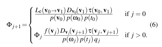 3. VPL을 생성해요. 생성된 경로 정점 Vj+1의 위치에 가상 점광원(VPL)을 저장합니다. VPL의 "플럭스"는 다음과 같이 계산해요.