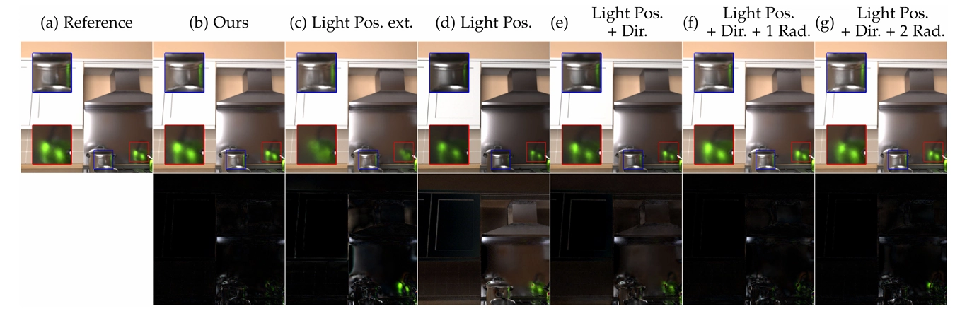 Radiance Cues. 아주 반짝이거나 완벽하게 거울 같은 반사 표면에서는 BRDF가 거의 모든 곳에서 값이 0인 델타 분포이기 때문에 직접 조명이 항상 검게 보이거든요. 이런 경우에는 직접 조명이 입사 조명에 대한 정보를 거의 제공하지 않아서, 신경망이 조명이 변하는 것에 대해 알지 못하게 돼요. 우리는 Deferred Neural Lighting [14]에서 영감을 받아서, 알려지지 않은 기하학과 재료를 가진 장면의 입사 조명을 표현하기 위해 radiance cues를 사용해요. 우리는 radiance cues를 추가적인 입사 조명 표현으로 적응시켰어요.