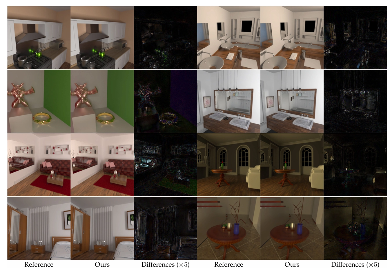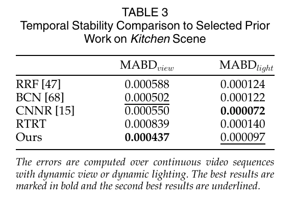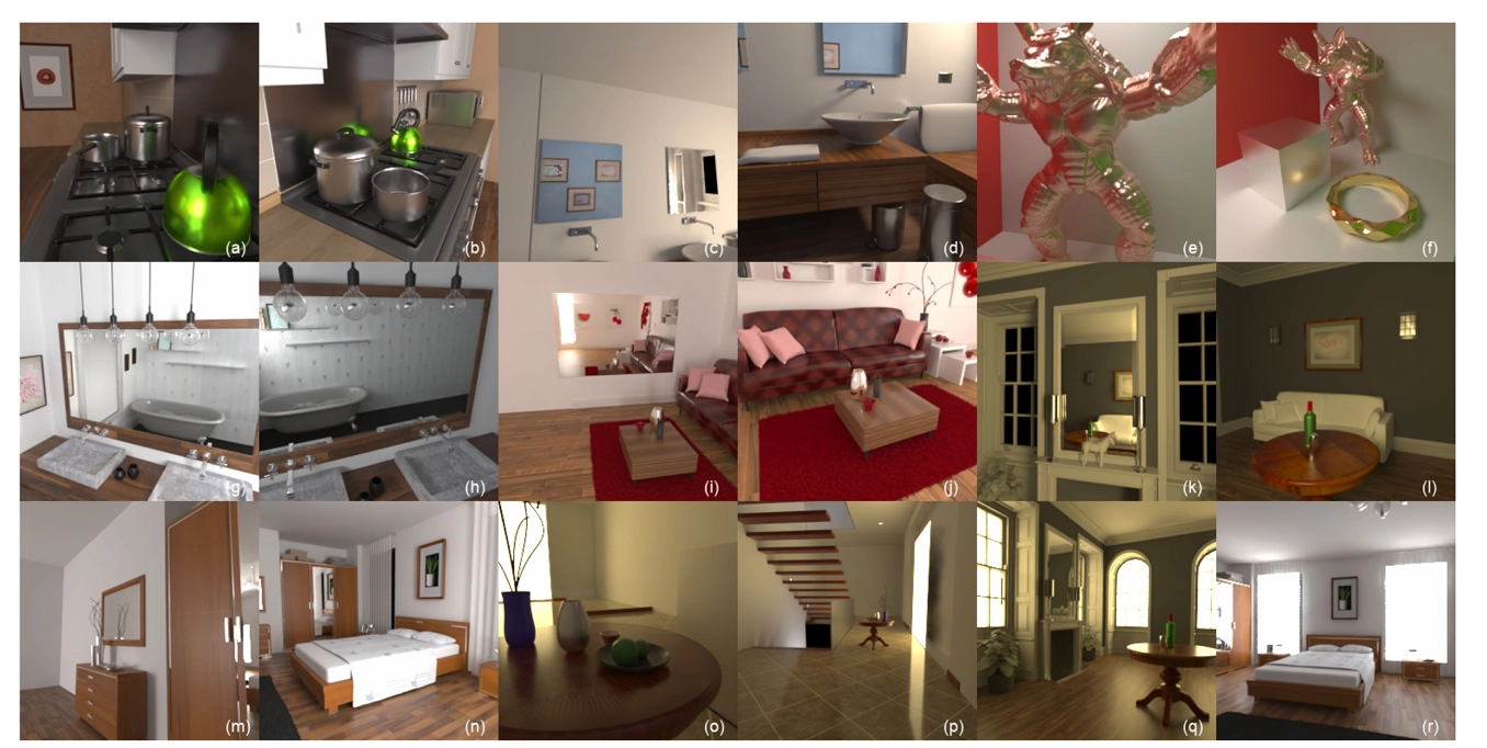 마지막으로, 우리 방법은 다양한 글로벌 조명 효과(예: 광택 있는 상호 반사, 카우스틱, 색 번짐), 재료 특성(예: 확산, 광택, 거울) 및 기하학적 복잡성(예: 거실-3과 침실의 잔디 같은 카펫, 거실, 계단-2, 거실-3의 식물)을 보여주는 실내 장면에 대해 고품질의 렌더링 결과를 생성할 수 있어요. 하지만, 우리 방법은 중간 크기의 실내 장면에만 제한되며, 대규모의 개방형 장면에는 확장할 수 없어요.