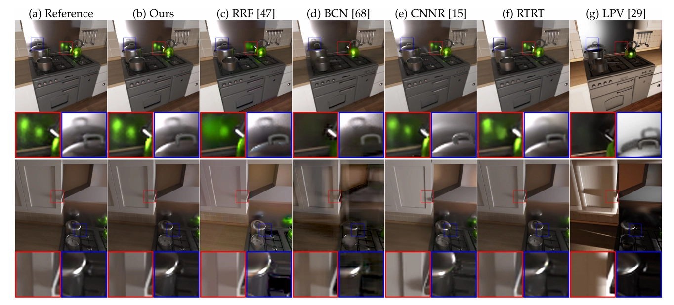 radiance cache를 path tracing 렌더링 중에 학습하는 방법을 제안했어요. 하지만 NRC는 그림자나 caustics처럼 지역 표면 특징과 관련 없는 고주파수 global illumination 효과를 포착하지 못해요. 실시간 성능을 달성하기 위해 NRC는 딥러닝 기반의 실시간 denoiser [20]에 의존해서 노이즈 없는 이미지를 생성해요. 최신 denoising 알고리즘은 광택 반사나 caustics 같은 고주파수 간접 조명을 재구성하는 데 실패하죠. 그래서 NRC는 denoising 후에 고주파수 global illumination 효과에 대해 흐릿한 결과를 생성하게 돼요. 반면에, 우리 방법은 caustics(그림 1d에 표시된 것처럼) 같은 고주파수 global illumination을 지원하고, denoiser를 적용하지 않고도 실시간으로 노이즈 없는 결과를 생성할 수 있어요. 게다가, NRC는 높은 성능을 달성하기 위해 많은 복잡한 엔지니어링이 필요하지만, 우리 방법은 기존의 렌더링 엔진과 딥러닝 프레임워크에 특별한 엔지니어링 최적화 없이도 매끄럽게 통합될 수 있답니다.
