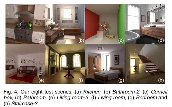 그림 4. 우리의 여덟 가지 테스트 장면. (a) 주방, (b) 욕실-2, (c) 코넬 박스, (d) 욕실, (e) 거실-3, (f) 거실, (g) 침실, (h) 계단-2. 우리는 TensorFlow [1]에서 우리 방법을 구현했고, Adam optimizer [30]를 사용하여 우리 프레임워크를 학습시켰어요. 서울과학기술대학교(SNUT)에 한정된 사용 허가가 있습니다. 2026년 1월 14일 06:32:25 UTC에 IEEE Xplore에서 다운로드되었습니다. 제한이 적용됩니다.
