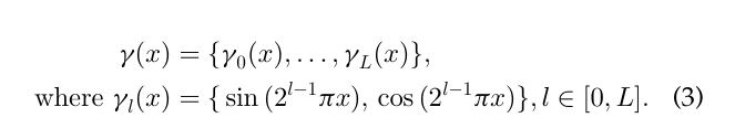 우리는 Mildenhall et al. [37]과 유사한 위치 인코딩 기법을 사용해요. 사전 정의된 Fourier feature 매핑을 통해 입력을 고차원 공간으로 변환하는 방식이죠. 여기서