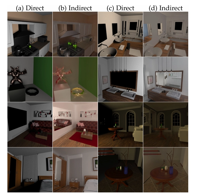 그림 15. 직접 조명(a, c)과 우리 방법으로 렌더링한 간접 조명(b, d)이 적용된 장면의 시각화입니다. 여기서 보시다시피, 이 장면들은 강한 다중 반사 간접 조명을 보여줘요.