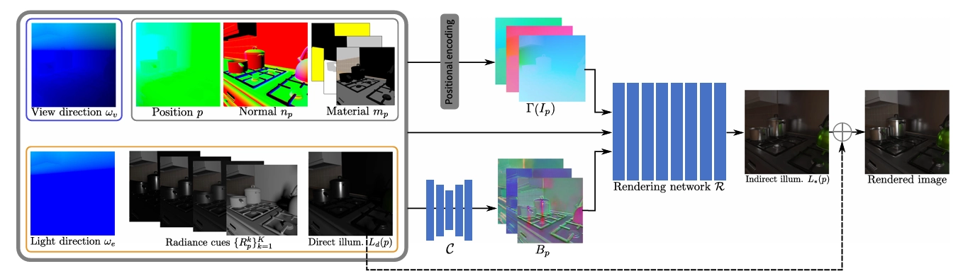 신경망을 학습한 후에는, 우리 방법을 통해 동적인 시점과 영역 조명 하에서의 global illumination을 합성할 수 있어요. 먼저, G-Buffer(위치, 시점 방향, 조명 방향, 법선 벡터, 재질 맵 포함), 직접 조명, 그리고 방사선 단서를 실시간 렌더링 파이프라인을 통해 렌더링해요. 그런 다음, positional encoding과 CNN 기반의 global feature 추출을 통해 고차원으로 인코딩된 입력을 얻어요. 이후, 이 모든 입력을 결합하여 MLP 렌더링 네트워크에 넣어 간접 조명을 생성해요. Global illumination은 렌더링된 직접 조명과 예측된 간접 조명의 합이에요.