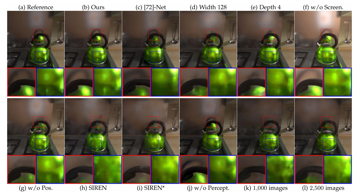 우리는 global illumination을 모델링하기 위해 deep fully-connected neural network(또는 multilayer perceptron, MLP라고도 불려요)를 사용해요. Global illumination은 고차원적이고 매우 비선형적인 함수라서, compact한 neural network로 고주파수 global illumination 효과를 효율적으로 학습하는 것은 쉽지 않답니다. 우리는 세 가지 전략을 소개해요.