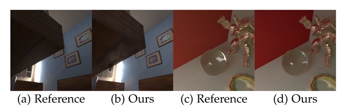 최근에 Bitterli 등 [4]은 공간 및 시간 영역에서 인근 샘플을 활용하여 실시간 ray tracing을 위한 새로운 알고리즘(ReSTIR)을 제안했어요. ReSTIR은 많은 조명이 있는 장면에서 고성능의 직접 조명 렌더링을 지원해요. 하지만 ReSTIR은 직접 조명에 한정되어 있고, 쉽게 global illumination으로 확장할 수는 없어요. 동시에, Müller 등 [39]은 신경망을 이용한