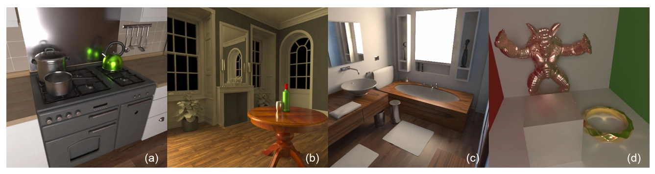 Fig. 1. Neural global illumination을 사용한 현실적인 렌더링 결과. (a) 다중 glossy interreflection이 있는 주방, (b) 거울 반사와 glossy 반사가 있는 거실, (c) 강한 간접 조명과 거울 반사가 있는 욕실-2, (d) 색상 번짐, glossy interreflection, caustics가 있는 Cornell box.