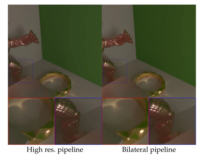 그림 13. 두 가지 고해상도 파이프라인과의 렌더링 품질 비교입니다. 우리 방법은 자연스럽게 고해상도 입력을 지원하고, 1024 X 1024 해상도에서 선명한 세부 사항을 생성할 수 있어요(왼쪽). 하지만 고해상도 입력을 직접 네트워크에 넣으면 시간이 더 걸리고, 실시간 성능을 달성할 수 없어요. 대신, 저해상도(256 X 256) 입력을 네트워크에 넣고, 양방향 업샘플링을 통해 고해상도 간접 조명 결과로 확장할 수 있답니다. 이 양방향 파이프라인(오른쪽)은 그럴듯한 고해상도 결과를 생성하고, 실행 시간 성능을 저해상도 결과와 거의 동일하게 유지해요.