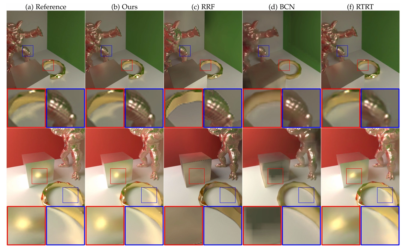 그림 11. 이전 연구와의 추가적인 질적 비교: RRF[47], BCN[68], 그리고 Cornell box 장면에서의 RTRT입니다. 우리 방법(b)은 참조(a)와 비교했을 때, 동적인 시점과 조명에서도 고품질의 caustics와 glossy 반사를 생성할 수 있어요. RRF(c)와 BCN(d)은 그럴듯한 diffuse global illumination을 생성할 수 있지만, 고주파 반사와 caustics를 예측하는 데 실패합니다. RTRT는 과도하게 흐릿한 glossy 반사를 생성하며, 고품질의 caustics를 재현할 수 없습니다.