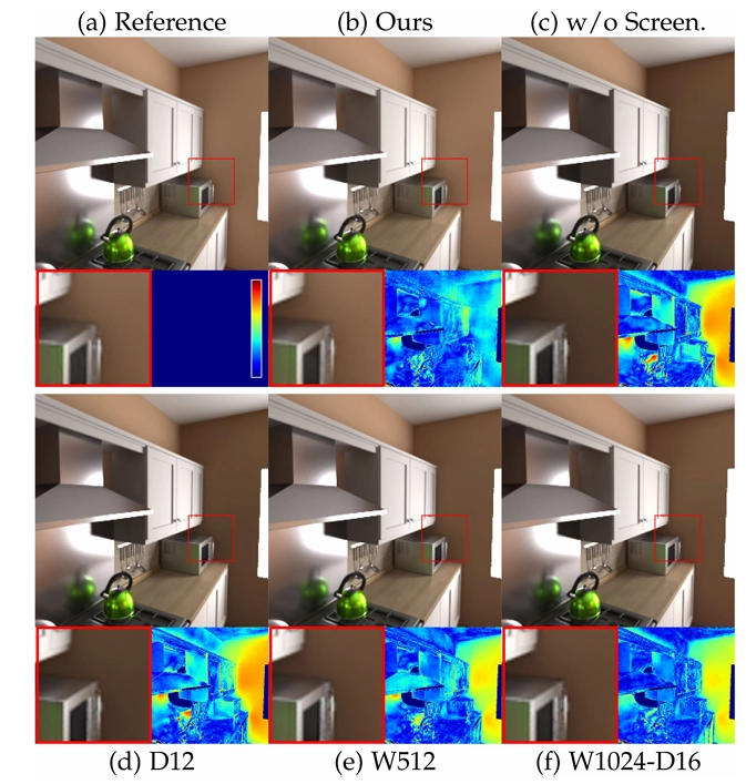 렌더링 네트워크에 글로벌 조명을 효율적으로 계산하는 방법을 알려주는 화면 공간 신경 버퍼가 있어요.