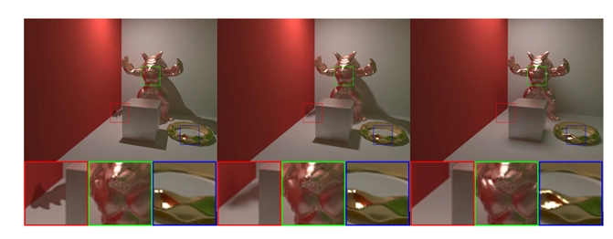 앞서 언급했듯이, 우리 방법은 재훈련 없이도 더 높은 해상도(예: 512 X 512)로 확장할 수 있어요. 실제로, 높은 해상도의 G-buffer(예: normal과 position)를 활용한 joint bilateral upsampling을 사용해서, 네트워크가 생성한 저해상도의 간접 조명을 확대하여 대화형 실행 시간을 달성해요 [31], [68]. 최종 렌더링 이미지는 업샘플링된 간접 조명과 고해상도의 직접 조명을 합한 것으로, 실행 시간과 시각적 품질 사이의 균형을 잘 맞추고 있어요. 이는 그림 13에 나와 있답니다.
