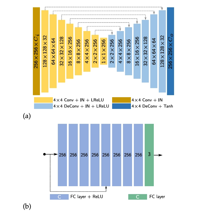 그림 3. CNN 화면 공간 신경 버퍼 추출 네트워크 C (a)와 MLP 렌더링 네트워크 R (b)의 네트워크 구조입니다. R의 마지막 층 이후에는 활성화 함수가 적용되지 않음을 주의하세요.