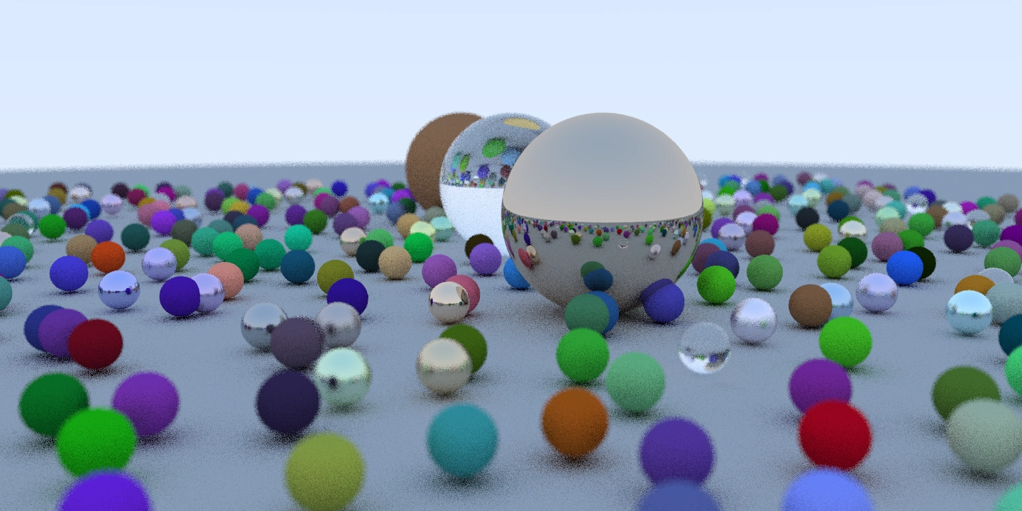 서로 다른 재질(Lambertian / Metal / Dielectric)을 확률적으로 섞고