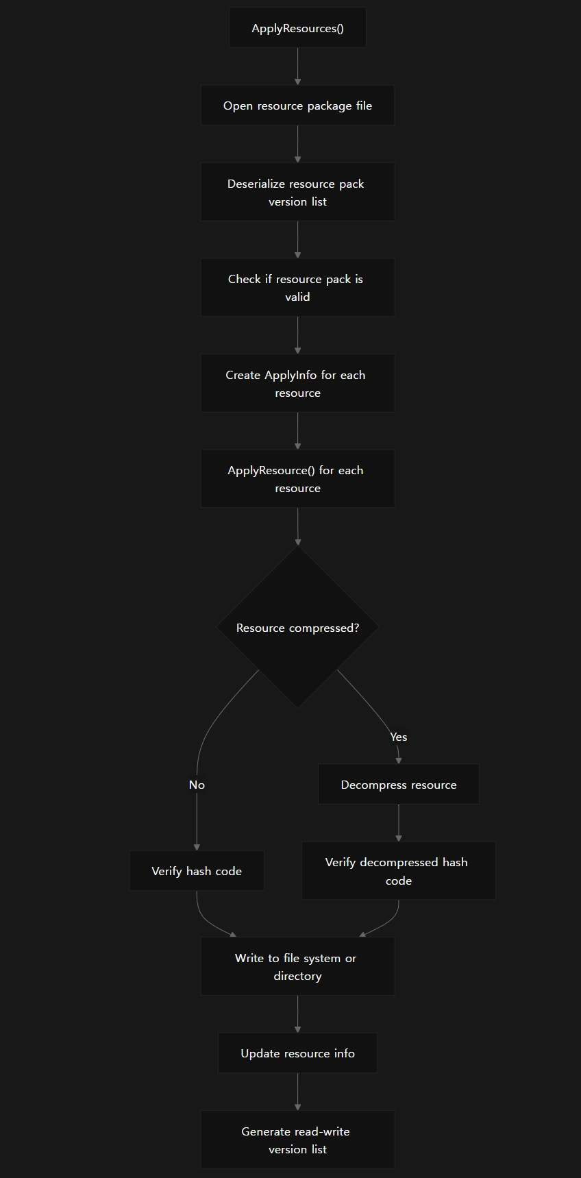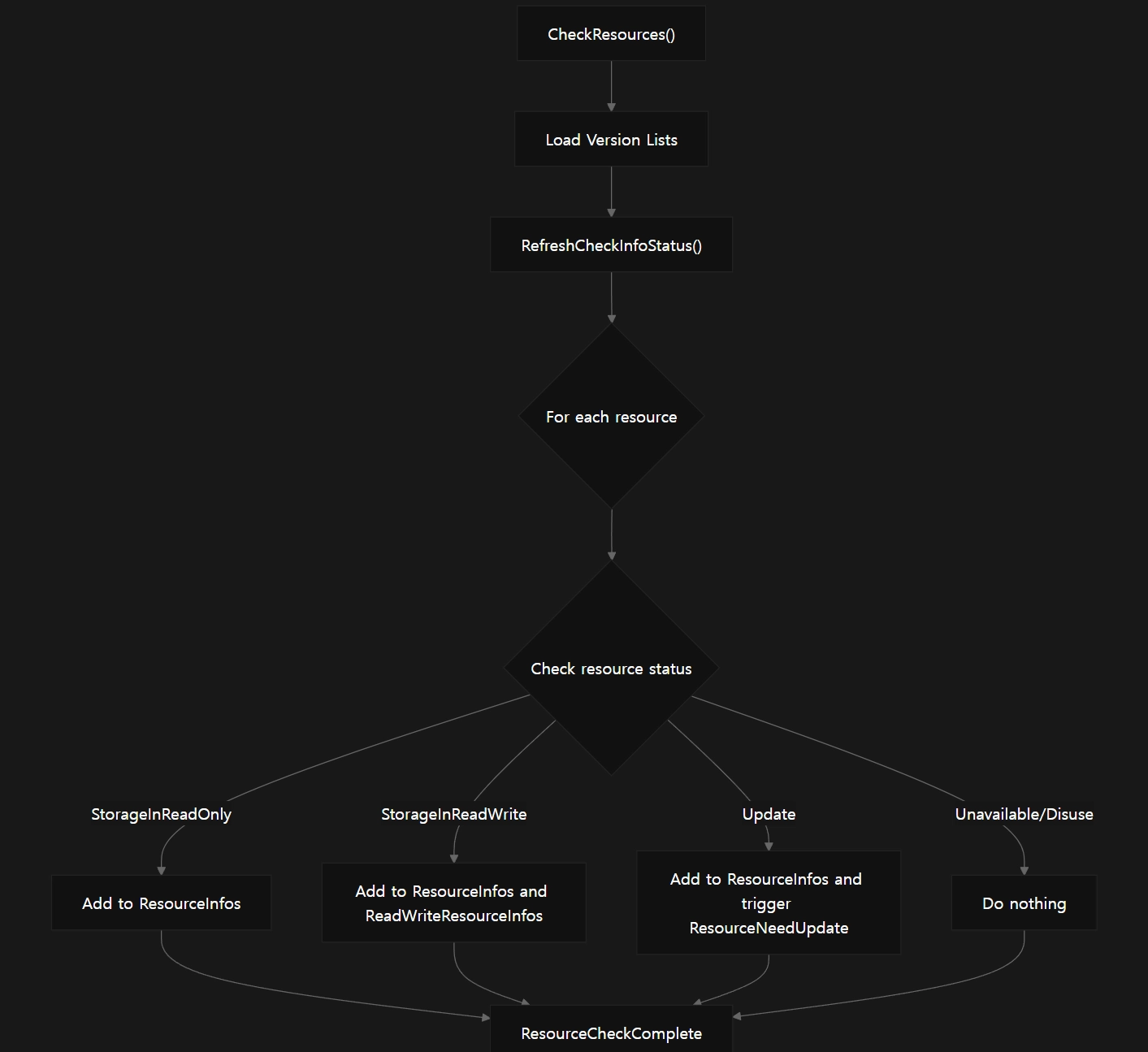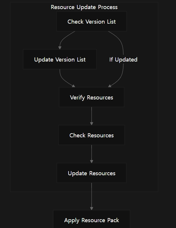 *리소스 업데이트(Resource Updating)**는 게임 실행 중 원격 서버에서 리소스를 확인(Check), 검증(Verify), 다운로드(Download), **적용(Apply)**하는 기능을 제공하는 서브시스템입니다.