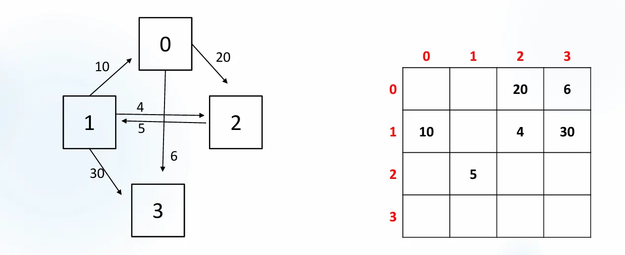 값이 0이 아니면 연결되어 있으며, 그 값이 가중치(비용)