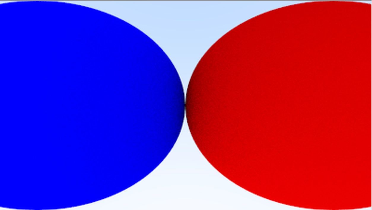 90° 시야각을 사용하여 두 개의 맞닿은 구로 이루어진 간단한 장면으로 이러한 변경 사항을 테스트해봅시다.