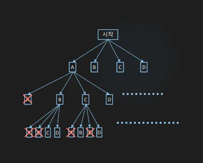 기본적인 재귀 함수 호출 시 특정 return 조건을 추가하여 진입하지 않을 조합을 줄이고, 인위적으로 막아주는 것이 있다.