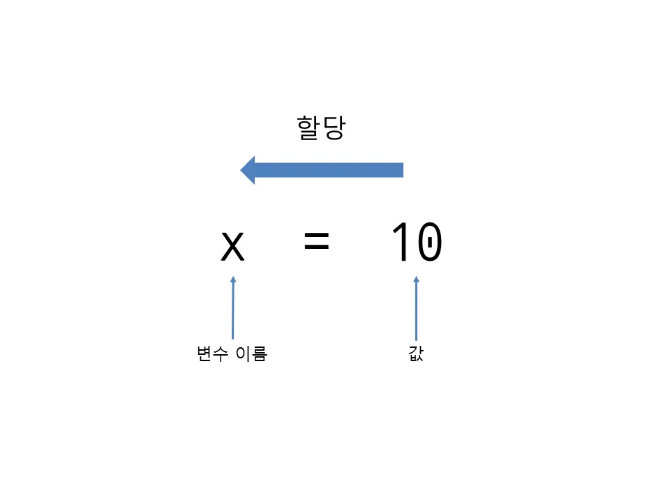 x = 10이라고 입력하면 10이 들어있는 변수 x가 만들어집니다. 즉, 변수이름 = 값 형식이죠. 이렇게 하면 변수가 생성되는 동시에 값이 할당(저장)됩니다.
