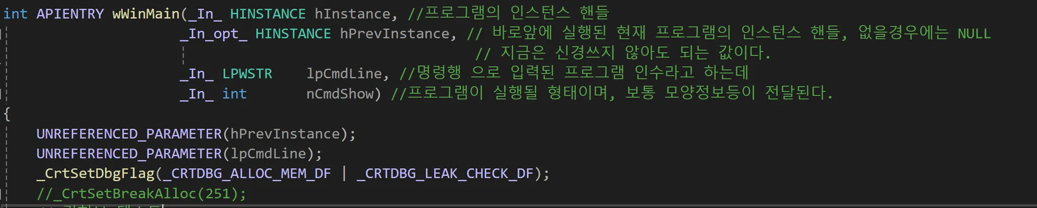 _CrtSetBreakAlloc(251); 함수에 해당 메모리 위치 번호를 넣어주면 해당 메모리가 생성되는 시점에