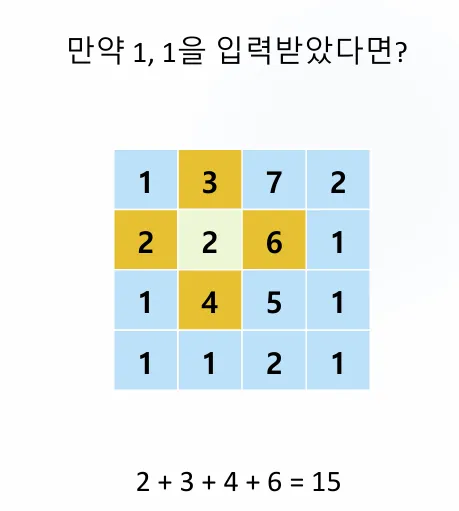 실행 결과: 기준점 (1,1)의 상하좌우 값들의 합 = 2 + 8 + 4 + 6 = 20