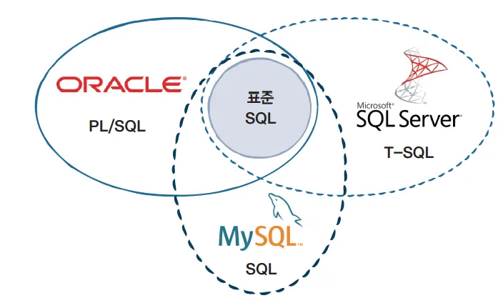 다음 그림을 보면 3가지 DBMS 제품(오라클, SQL 서버, MySQL)이 모두 표준 SQL을 포함하고 있습니다. 그래서 표준 SQL을 익히면 대부분의 DBMS에 공통적으로 적용할 수 있습니다. 각 DBMS는 추가로 자신만의 기능도 가지고 있어서 이렇게 변경된 SQL을 오라클은 PL/SQL, SQL서버는 T-SQL, MySQL은 SQL로 부릅니다.