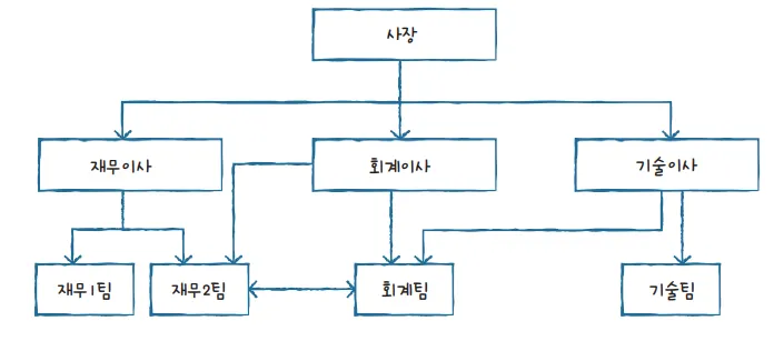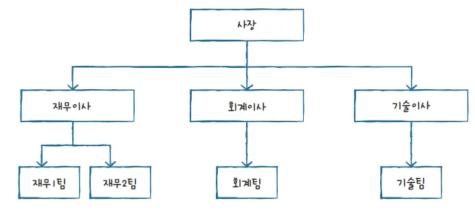 계층형 DBMS(Hierarchical DBMS)는 처음으로 등장한 DBMS 개념으로 1960년대에 시작되었습니다. 아래 그림과 같이 각 계층은 트리tree 형태를 갖습니다. 사장 1명에 이사 3명이 연결되어 있는 구조입니다. 계층형 DBMS의 문제는 처음 구성을 완료한 후에 이를 변경하기가 상당히 까다롭다는 것입니다. 또한 다른 구성원을 찾아가는 것이 비효율적입니다. 예를 들어 재무2팀에서 회계팀으로 연결하려면 재무이사 → 사장 → 회계이사 → 회계팀과 같이 여러 단계를 거쳐야 합니다. 지금은 사용하지 않는 형태입니다.