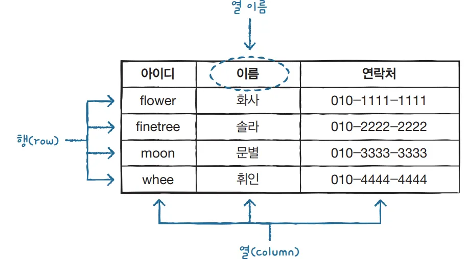 관계형 DBMS(Relational DBMS)는 줄여서 RDBMS라고 부릅니다. MySQL뿐만 아니라, 대부분의 DBMS가 RDBMS 형태로 사용됩니다. RDBMS의 데이터베이스는 테이블(table)이라는 최소 단위로 구성되며, 이 테이블은 하나 이상의 열(column)과 행(row)으로 이루어져 있습니다.