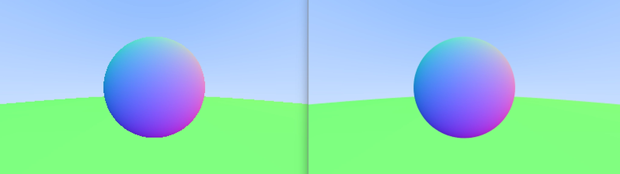 지금까지 렌더링된 이미지를 확대해보면, 이미지의 가장자리에서 거친 "계단 형태"를 발견할 수 있을 것입니다. 이러한 계단 형태는 일반적으로 "앨리어싱(aliasing)" 또는 "재기(jaggies)"라고 불립니다. 실제 카메라가 사진을 찍을 때는 보통 가장자리에 재기가 없는데, 이는 가장자리 픽셀이 일부 전경과 일부 배경의 혼합이기 때문입니다. 우리의 렌더링된 이미지와 달리, 실제 세계의 진정한 이미지는 연속적이라는 점을 고려해보세요. 다르게 말하면, 세계(그리고 그것의 모든 진정한 이미지)는 사실상 무한한 해상도를 가지고 있습니다. 우리는 각 픽셀에 대해 여러 샘플을 평균화함으로써 동일한 효과를 얻을 수 있습니다.