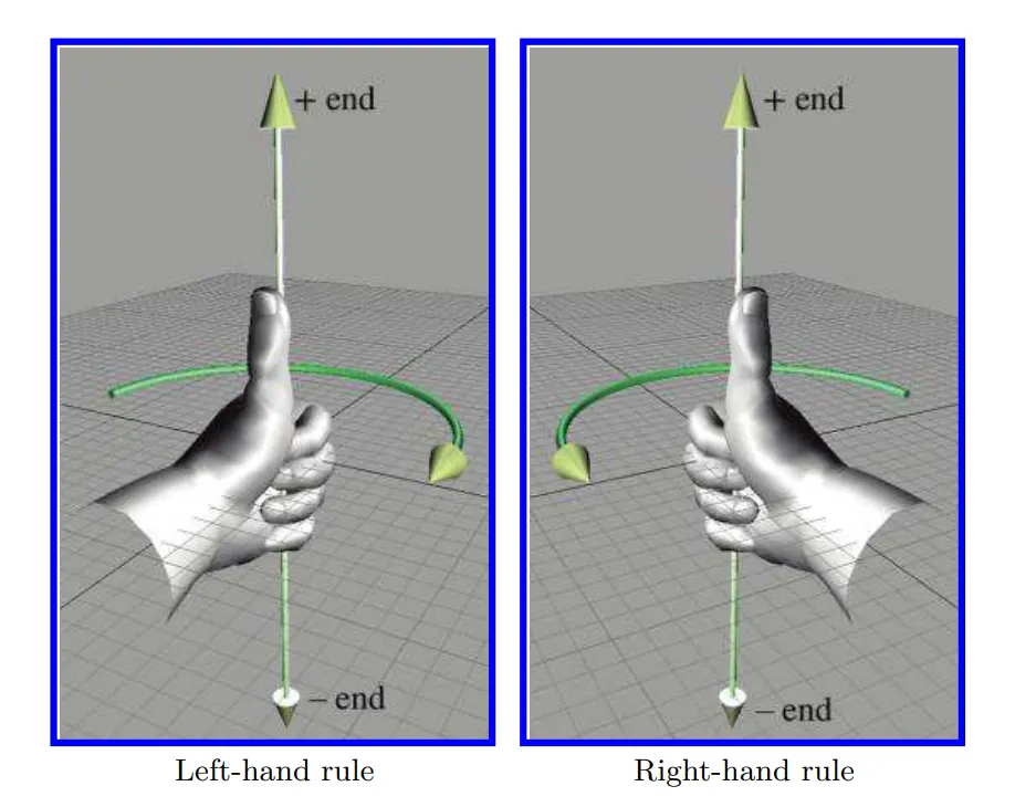 z축의 방향이 뒤집혀 있기때문에 위 그림과 같이 서로다른 좌표계에서는 반대쪽 방향으로 회전할수 있습니다. 왼손좌표계에서는 왼손을 들고 엄지를 세운후 손가락쪽으로 회전시키는걸 양의 방향으로 정해두었습니다. 오른손 좌표계에서는 양의 회전방향이 오른손 기준으로 손가락쪽 방향이기 때문에 반대 방향입니다.