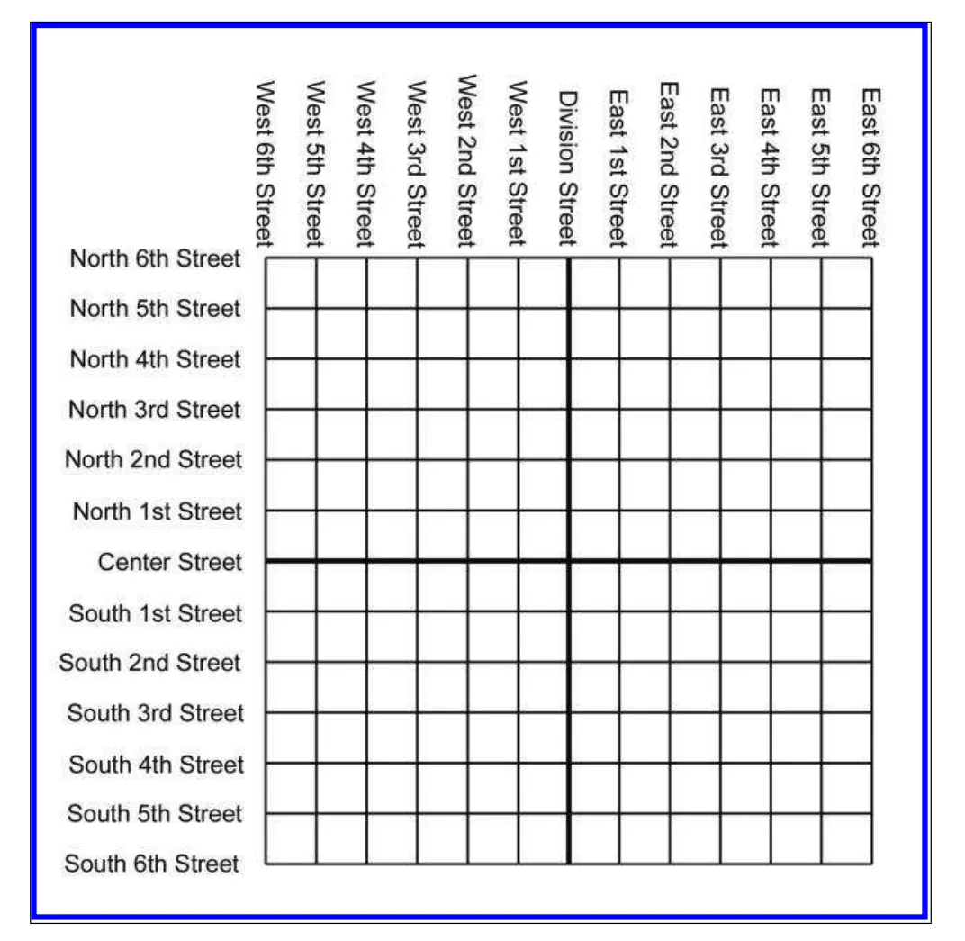 중점(Devision Street 과 Center Street의 교점) 을 기준으로 원하는 위치를 한칸씩 움직이면서 쉽게 찾아갈수 있게 됩니다. 예를들어 North 4th, West 2nd 위치에 도넛 가게가 있다면 중점을 기준으로